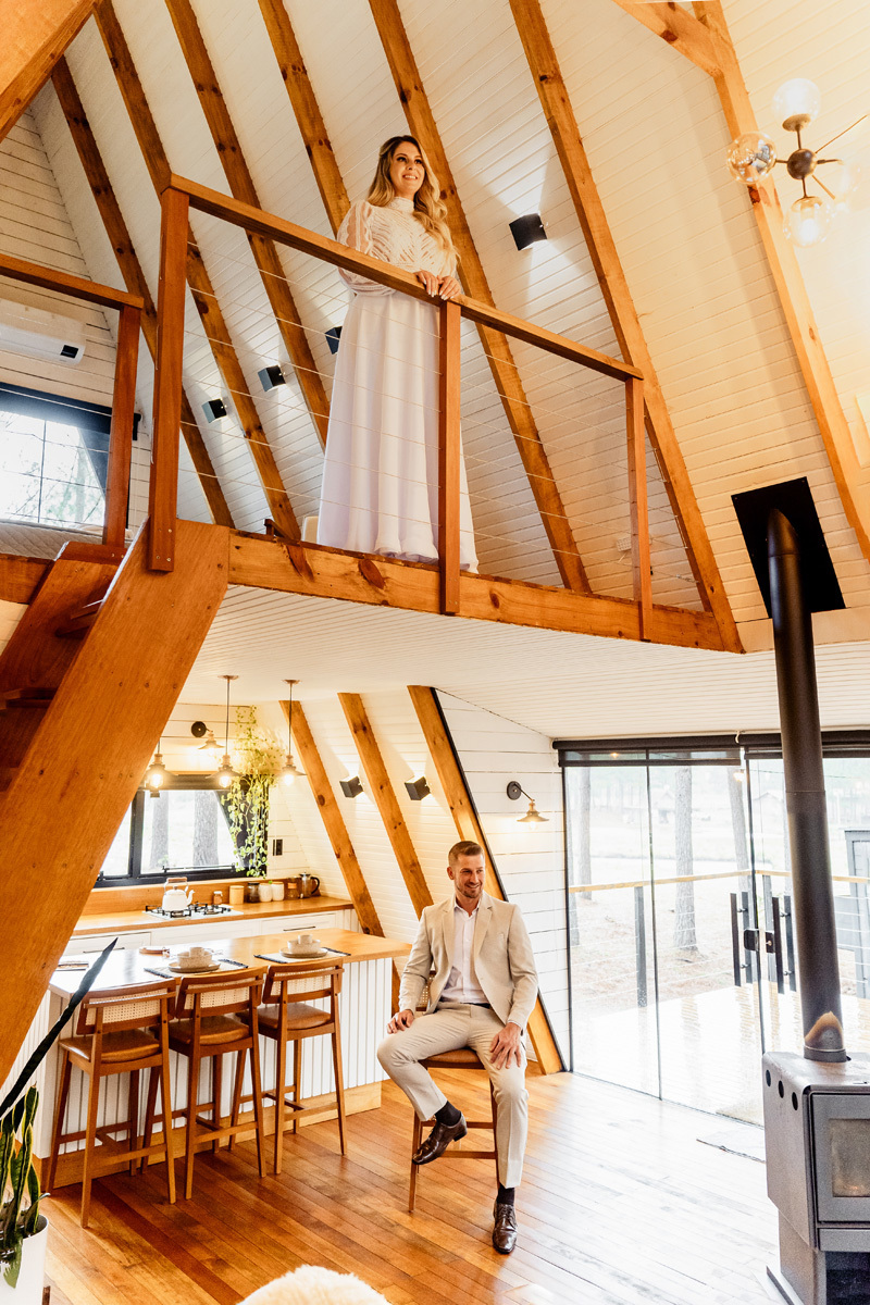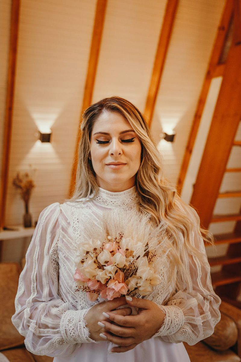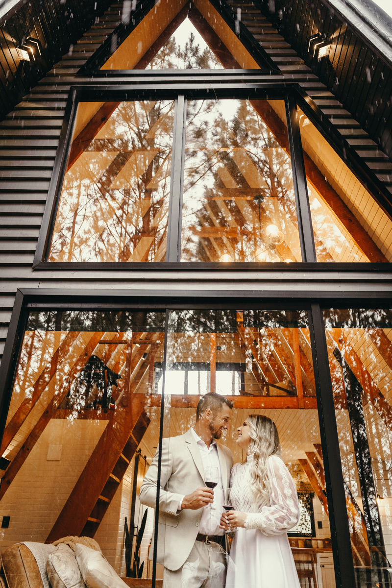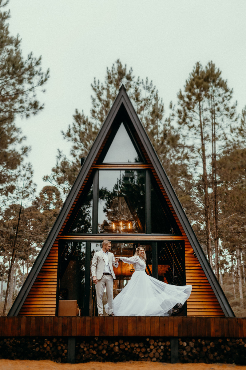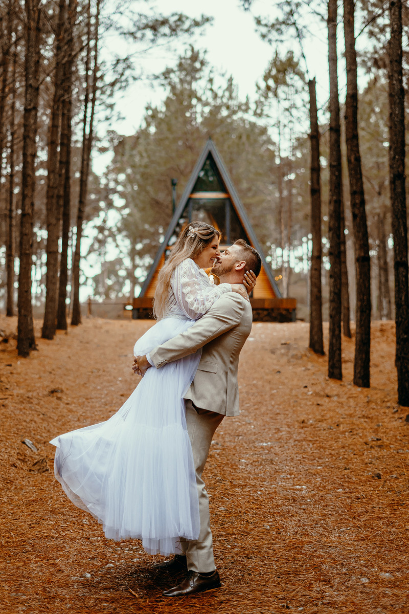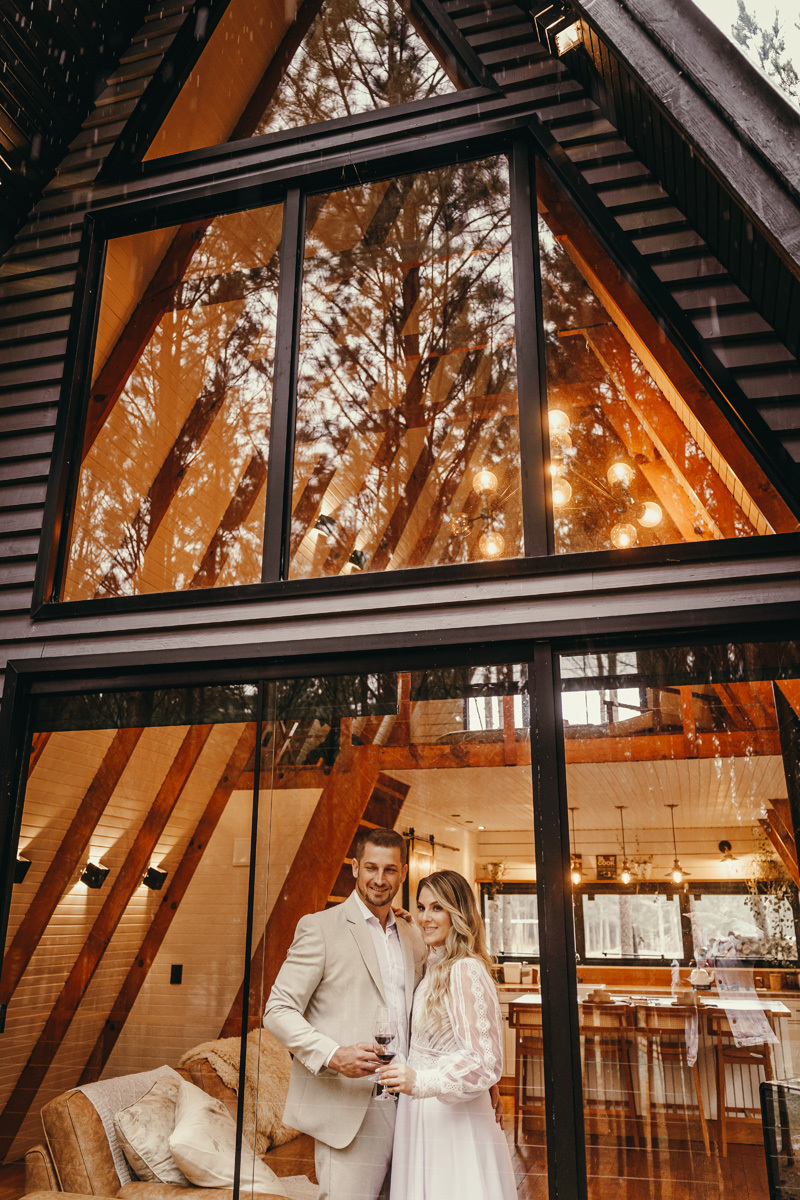 A chuva parou e a celebração a dois foi ao ar livre foi um momento emocionante e mágico, com os votos mais sinceros que já presenciei, e os sorrisos radiantes. No decorrer do final da tarde, o casal e eu fomos desbravando o local e de toda estrutura linda. A cabana, decorada com luzes suaves, parecia um refúgio de contos de fadas.