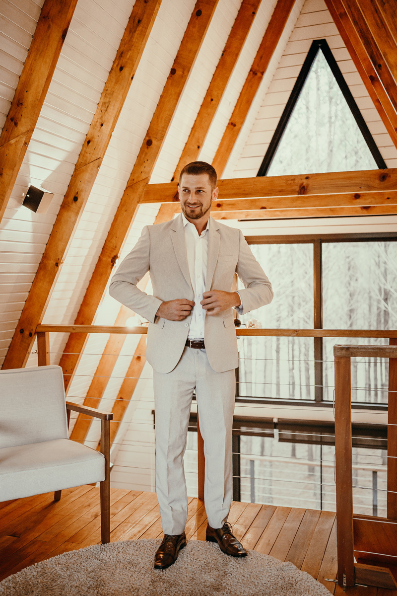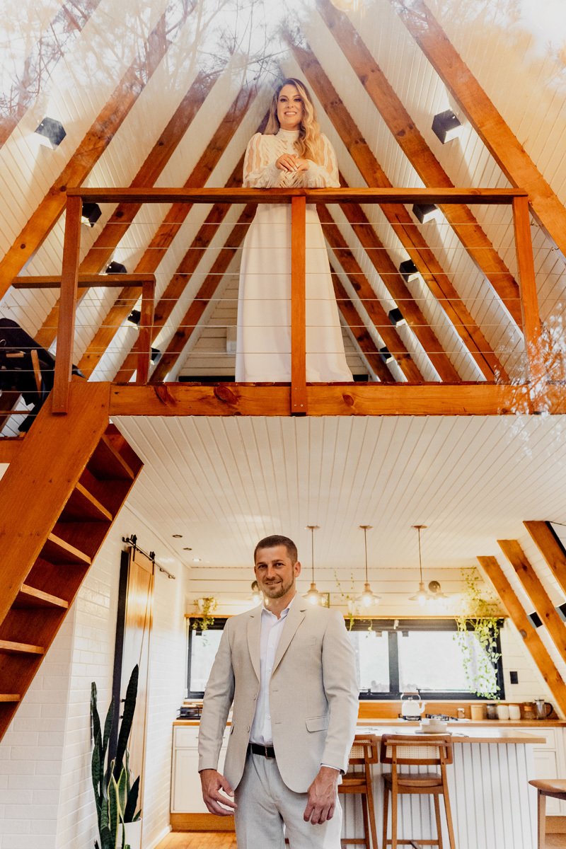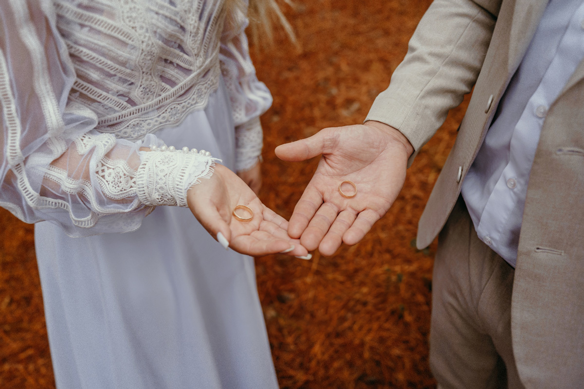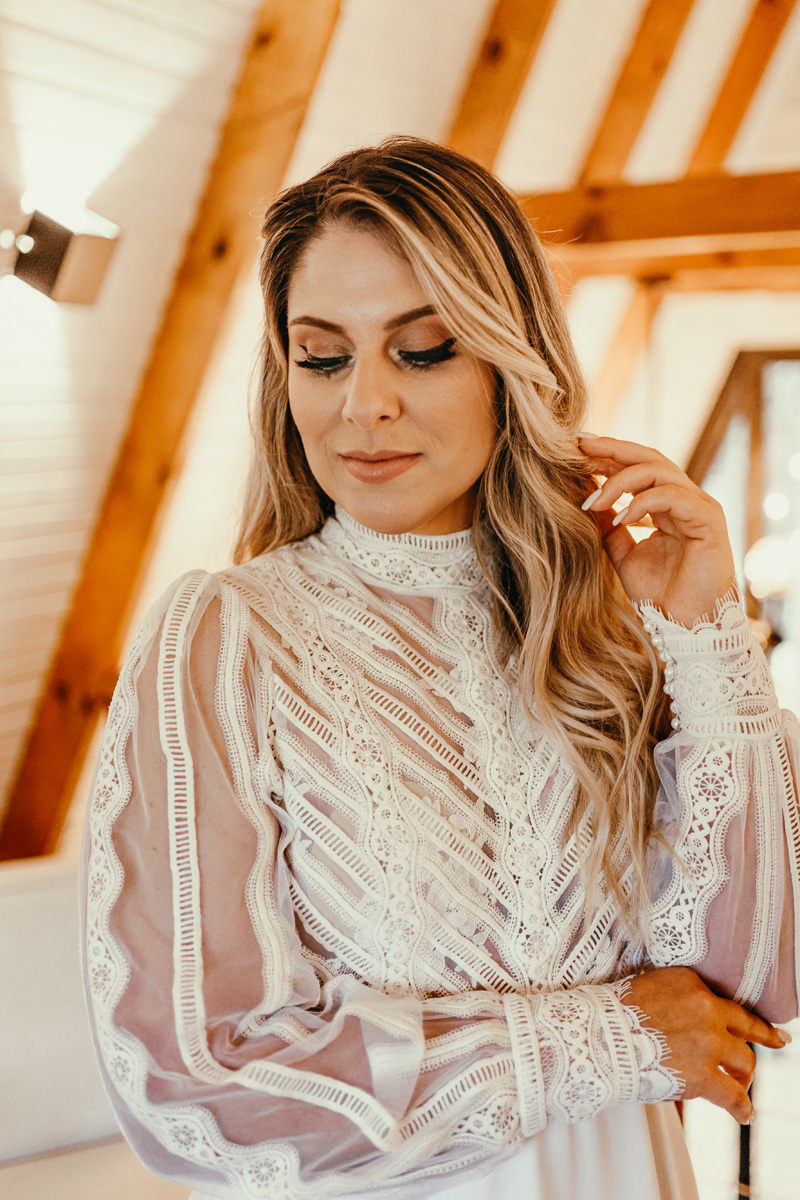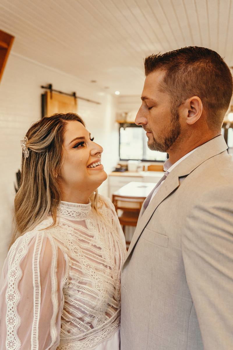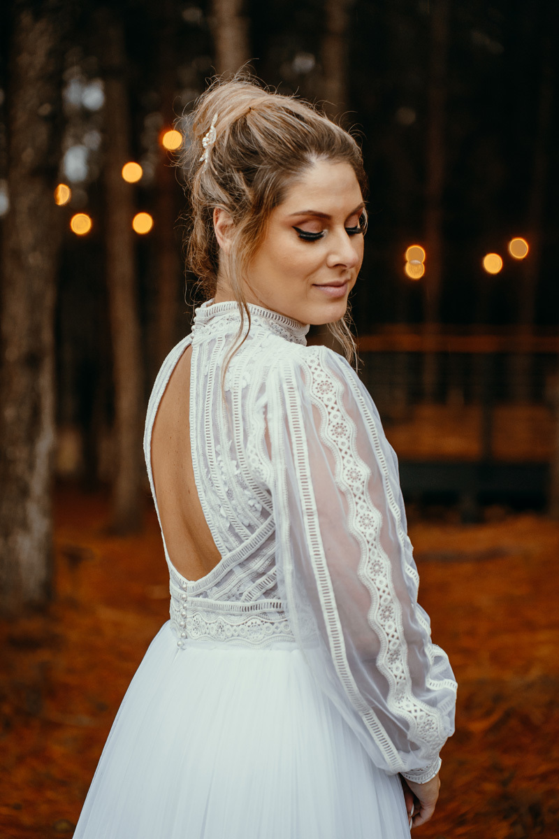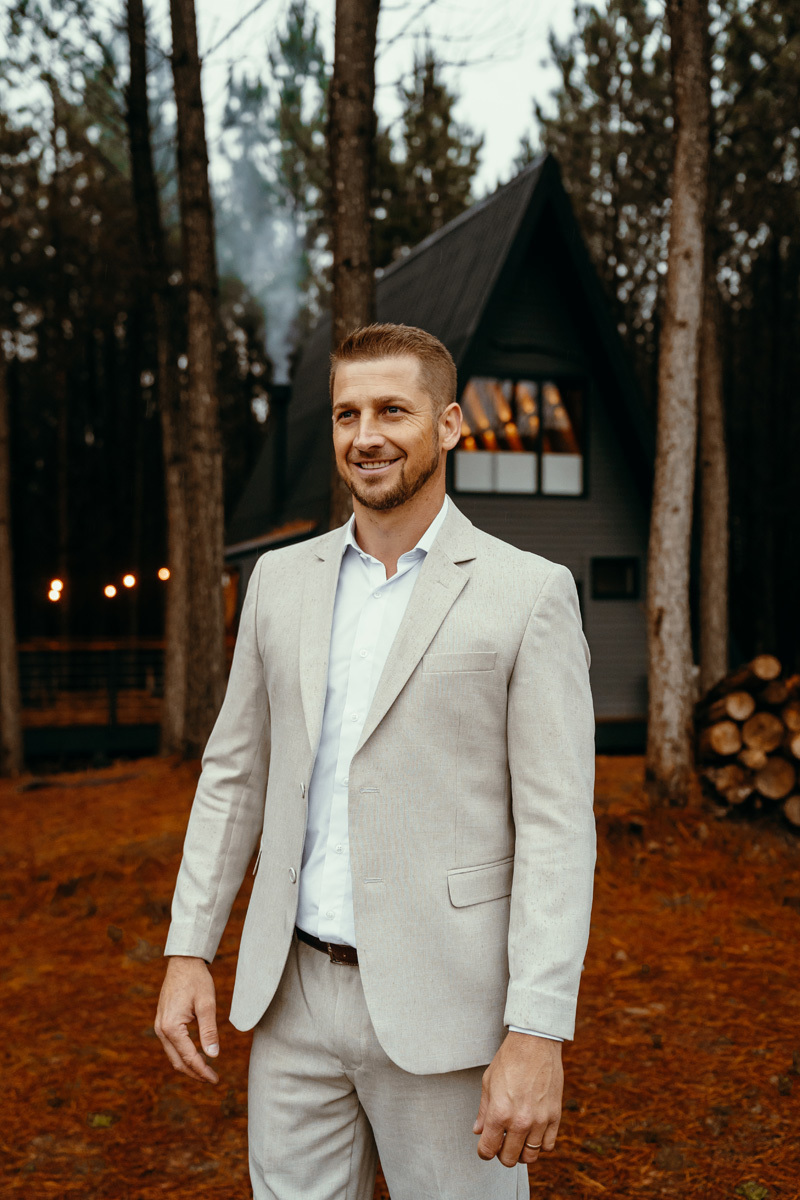 A chuva parou e a celebração a dois foi ao ar livre foi um momento emocionante e mágico, com os votos mais sinceros que já presenciei, e os sorrisos radiantes. No decorrer do final da tarde, o casal e eu fomos desbravando o local e de toda estrutura linda. A cabana, decorada com luzes suaves, parecia um refúgio de contos de fadas.