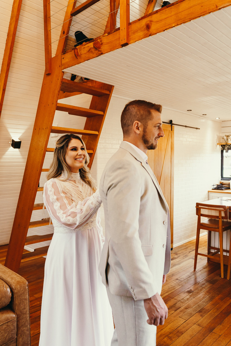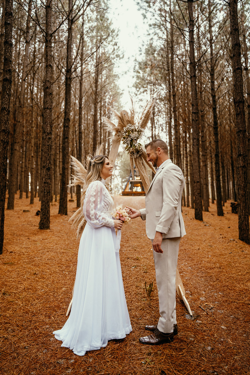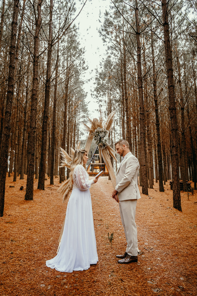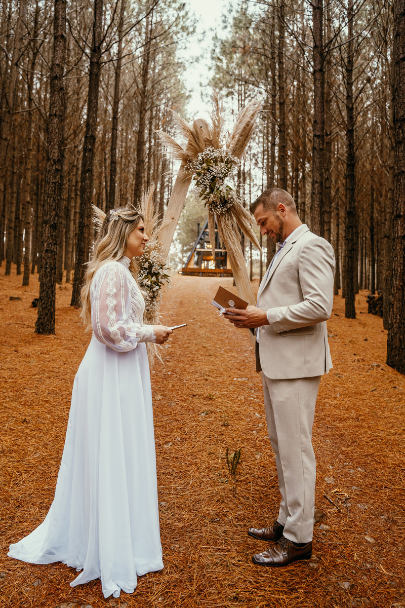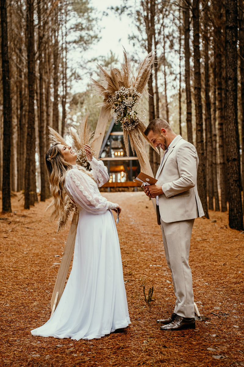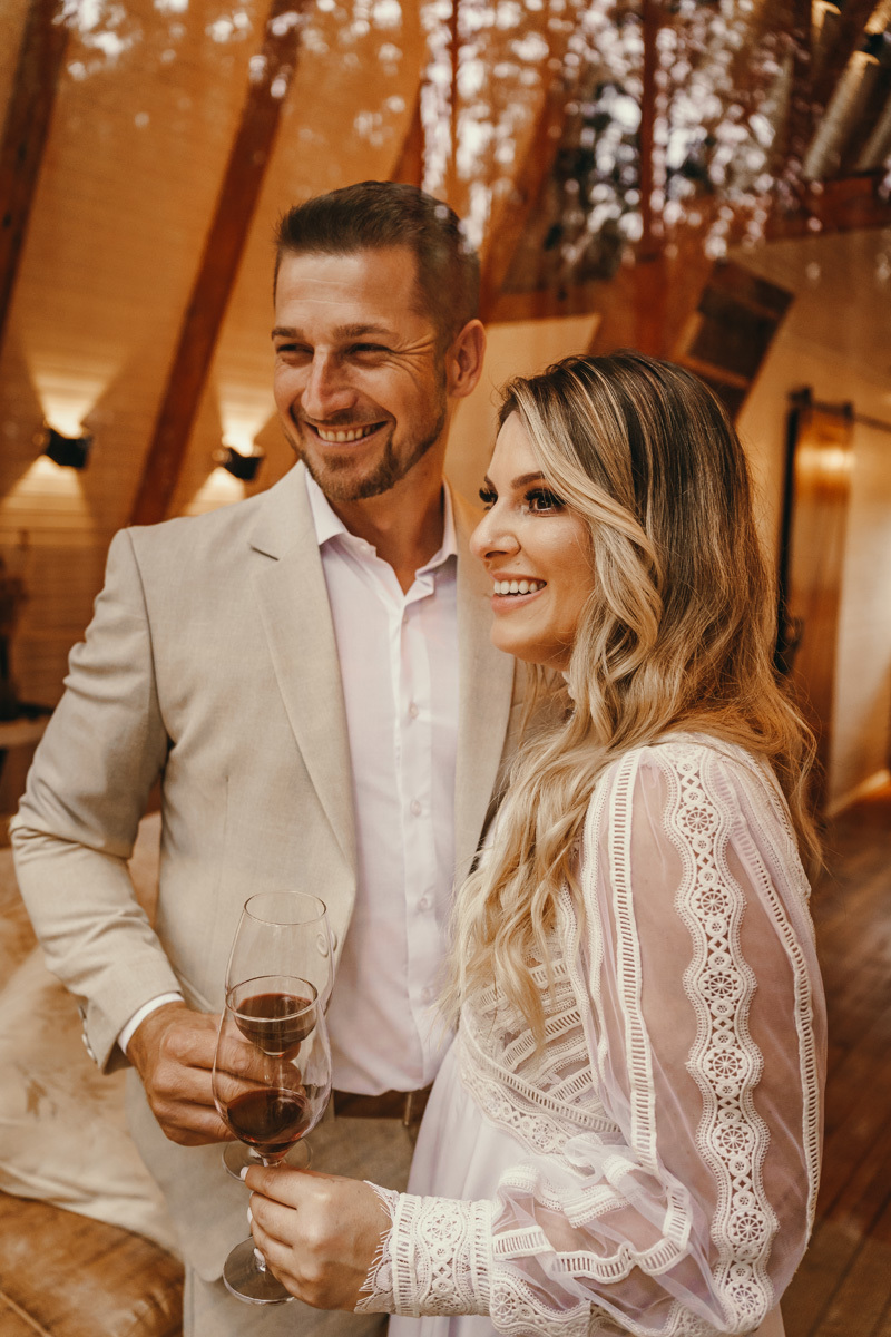 Eles estavam maravilhosos, o vestido boho, o costume em linho, a carta de votos escrita a mão. O primeiro encontro dentro da cabana, as lagrimas de emoção e alegria. A chuva caia la fora e eles optaram por viver esse momento bebendo um vinho.