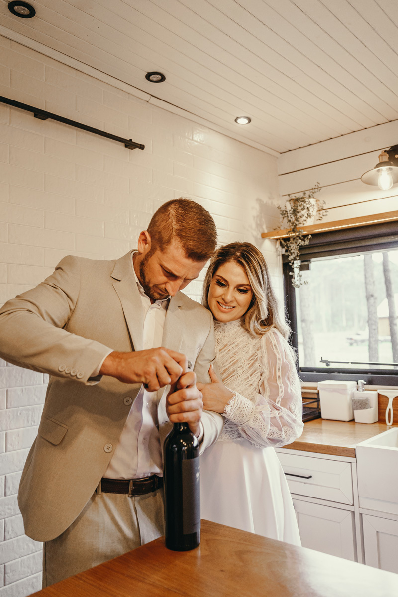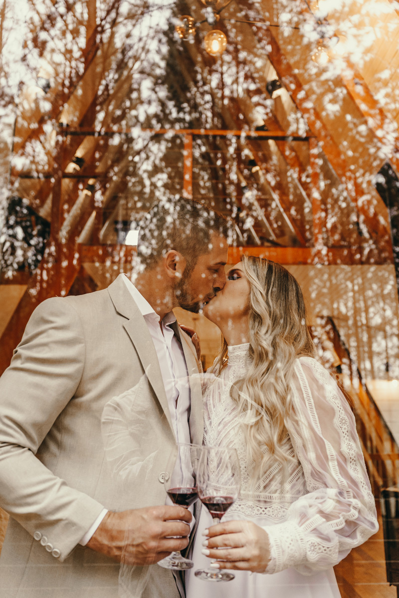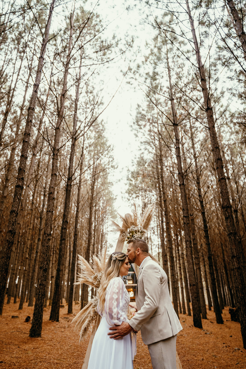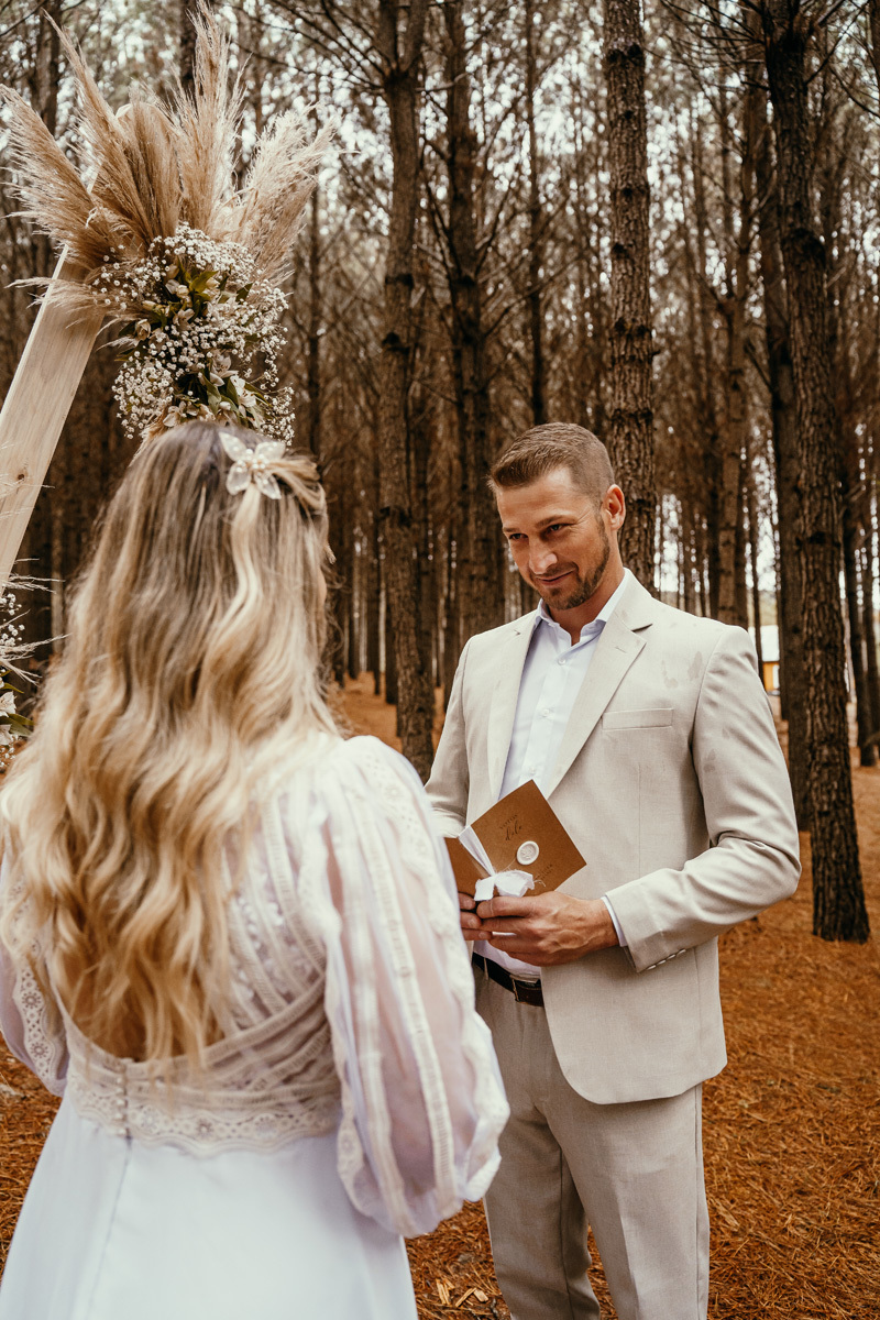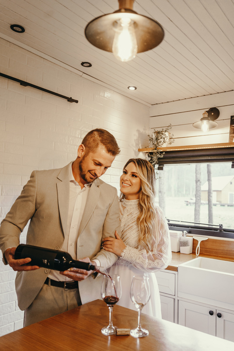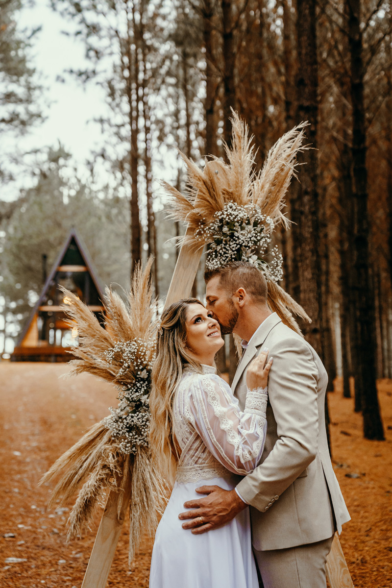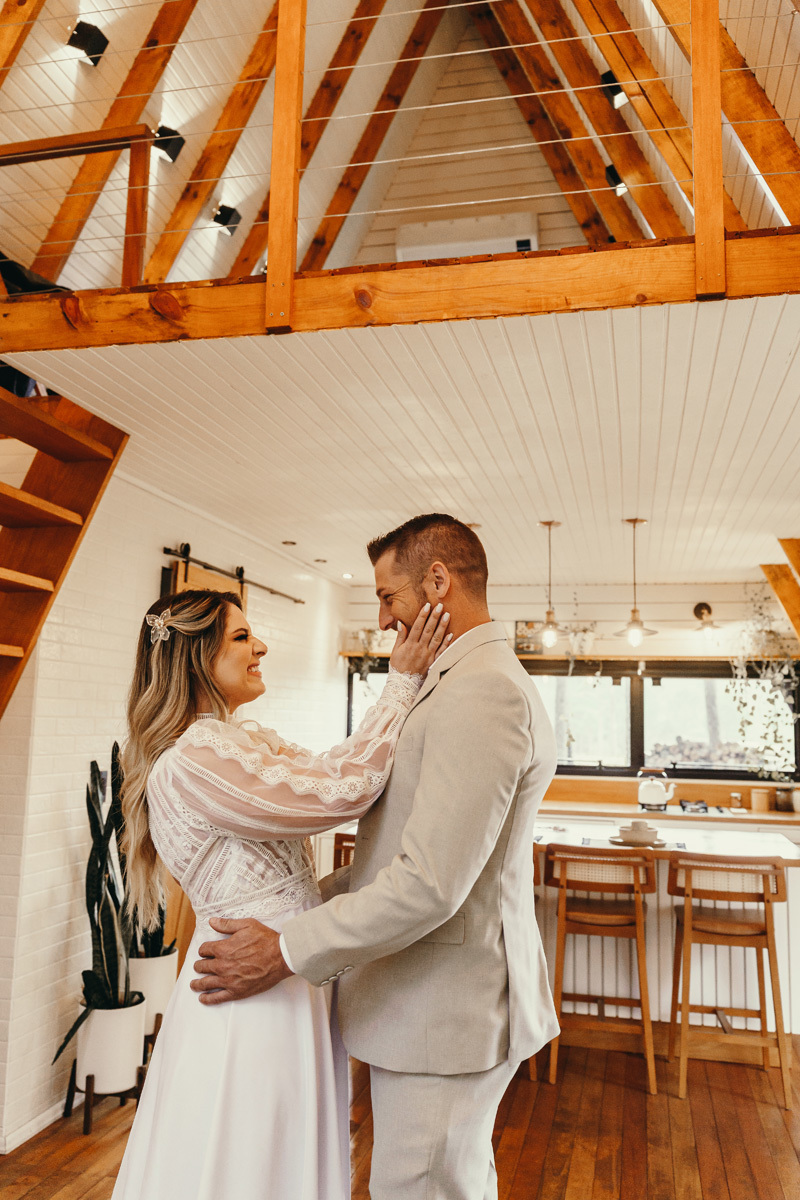 Eles estavam maravilhosos, o vestido boho, o costume em linho, a carta de votos escrita a mão. O primeiro encontro dentro da cabana, as lagrimas de emoção e alegria. A chuva caia la fora e eles optaram por viver esse momento bebendo um vinho.