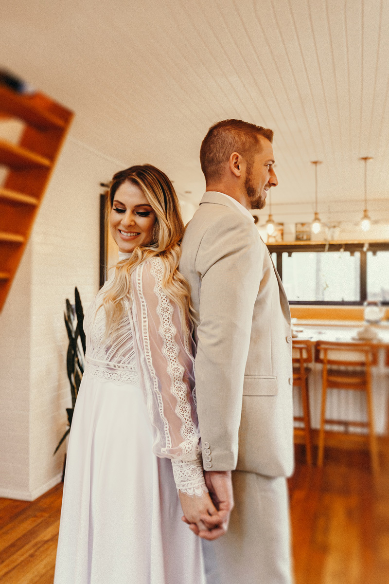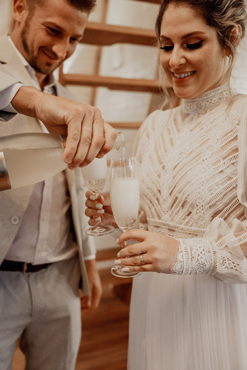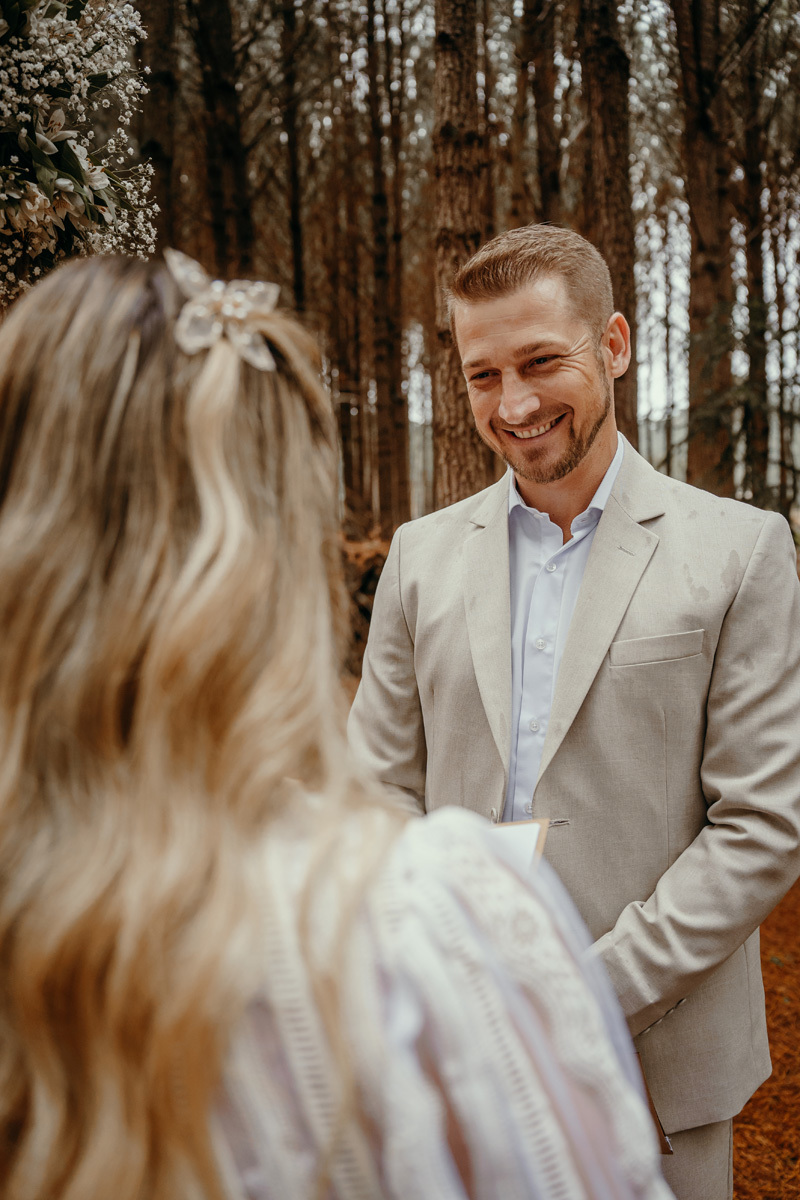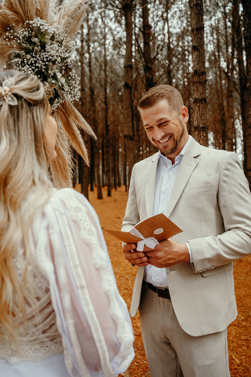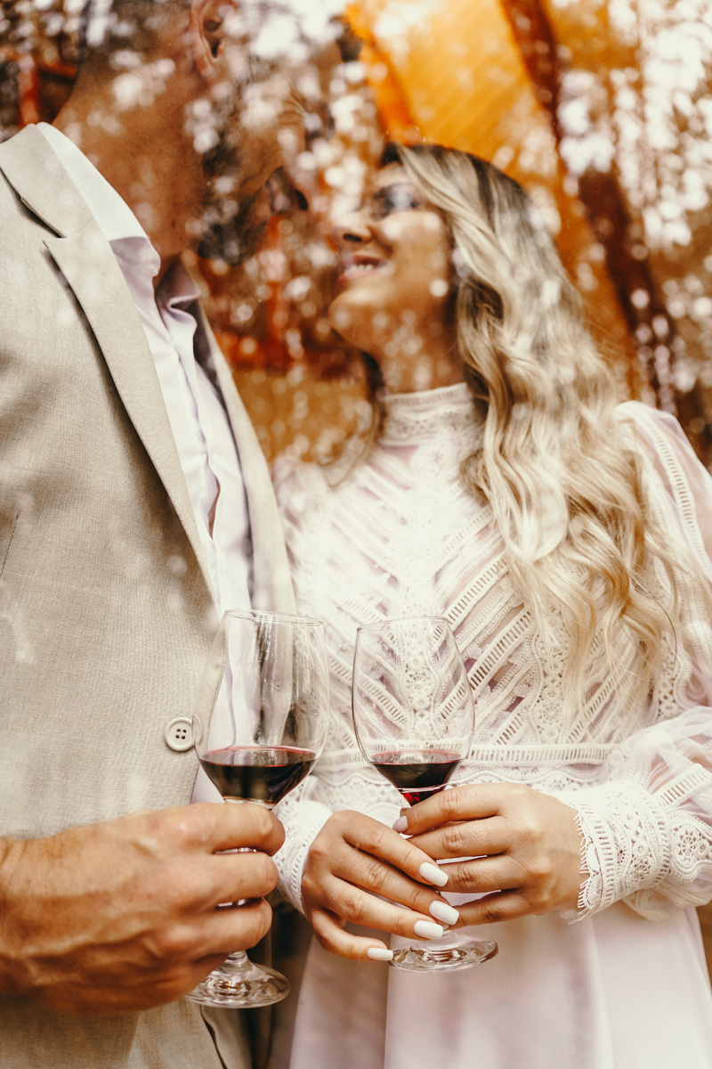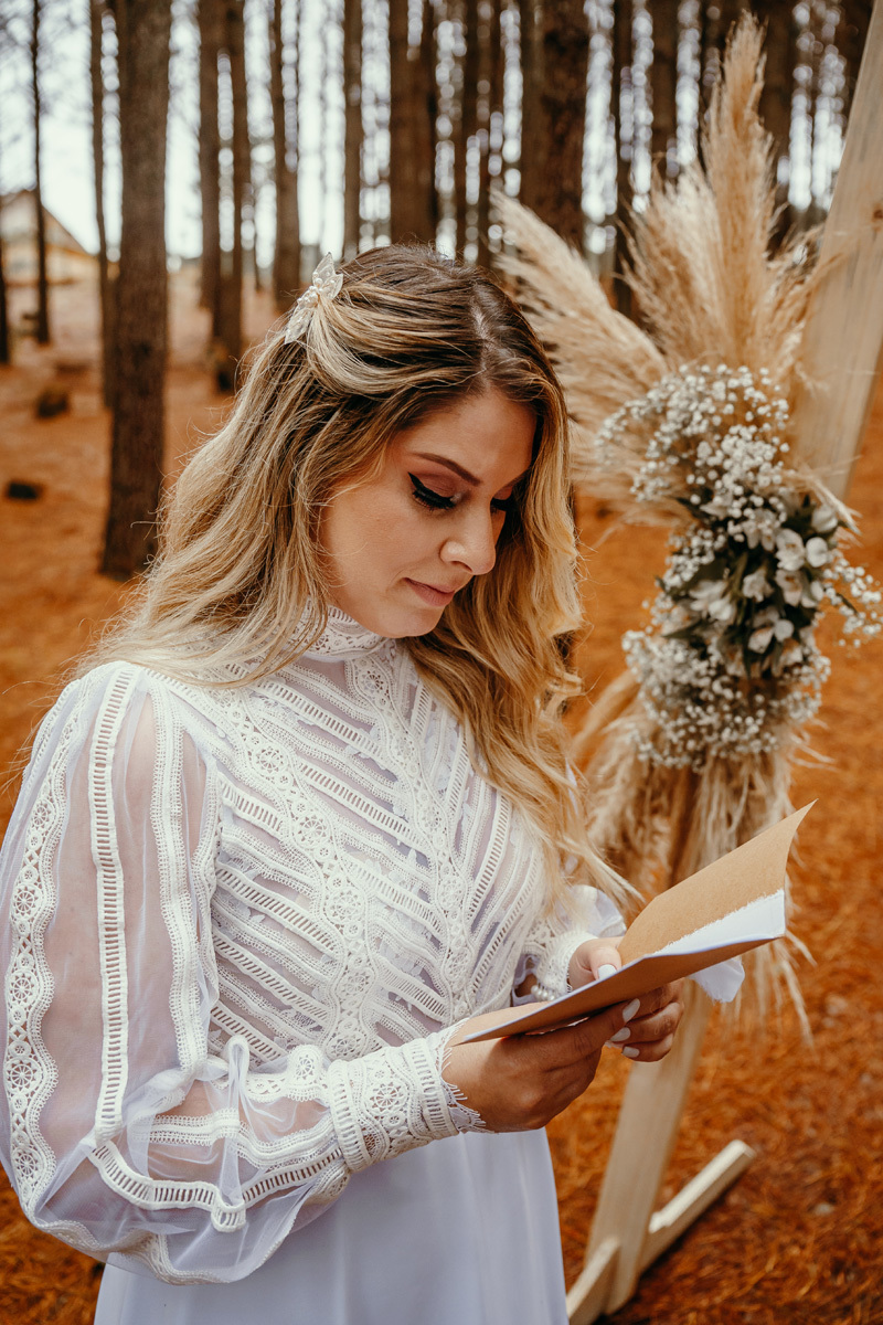 Eles estavam maravilhosos, o vestido boho, o costume em linho, a carta de votos escrita a mão. O primeiro encontro dentro da cabana, as lagrimas de emoção e alegria. A chuva caia la fora e eles optaram por viver esse momento bebendo um vinho.