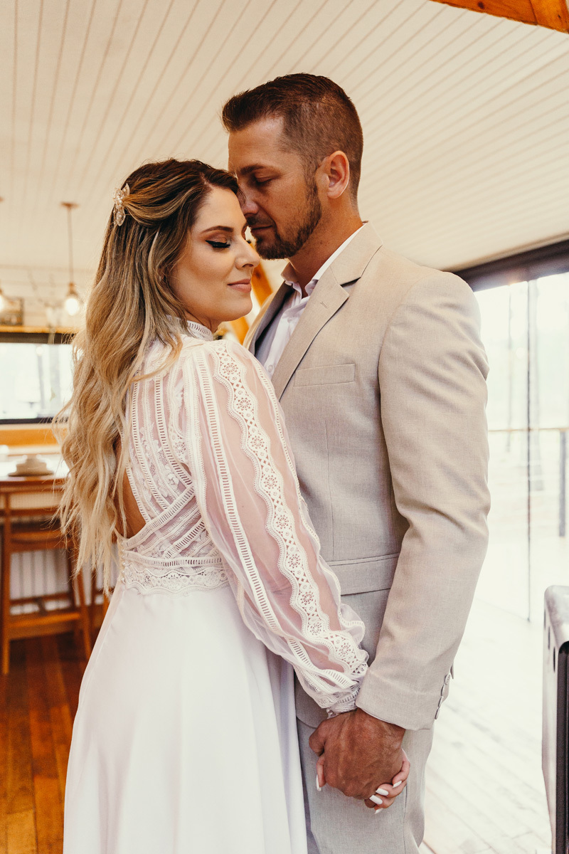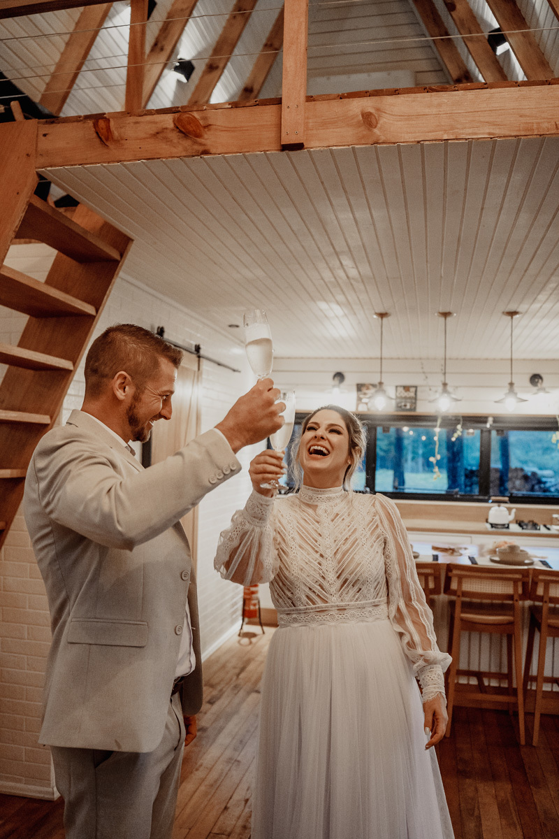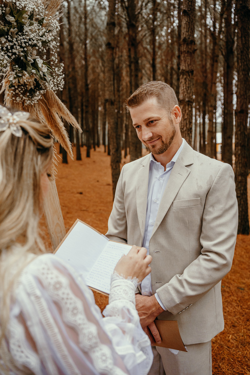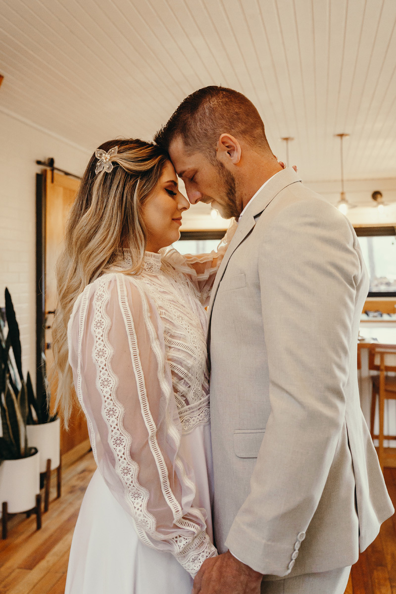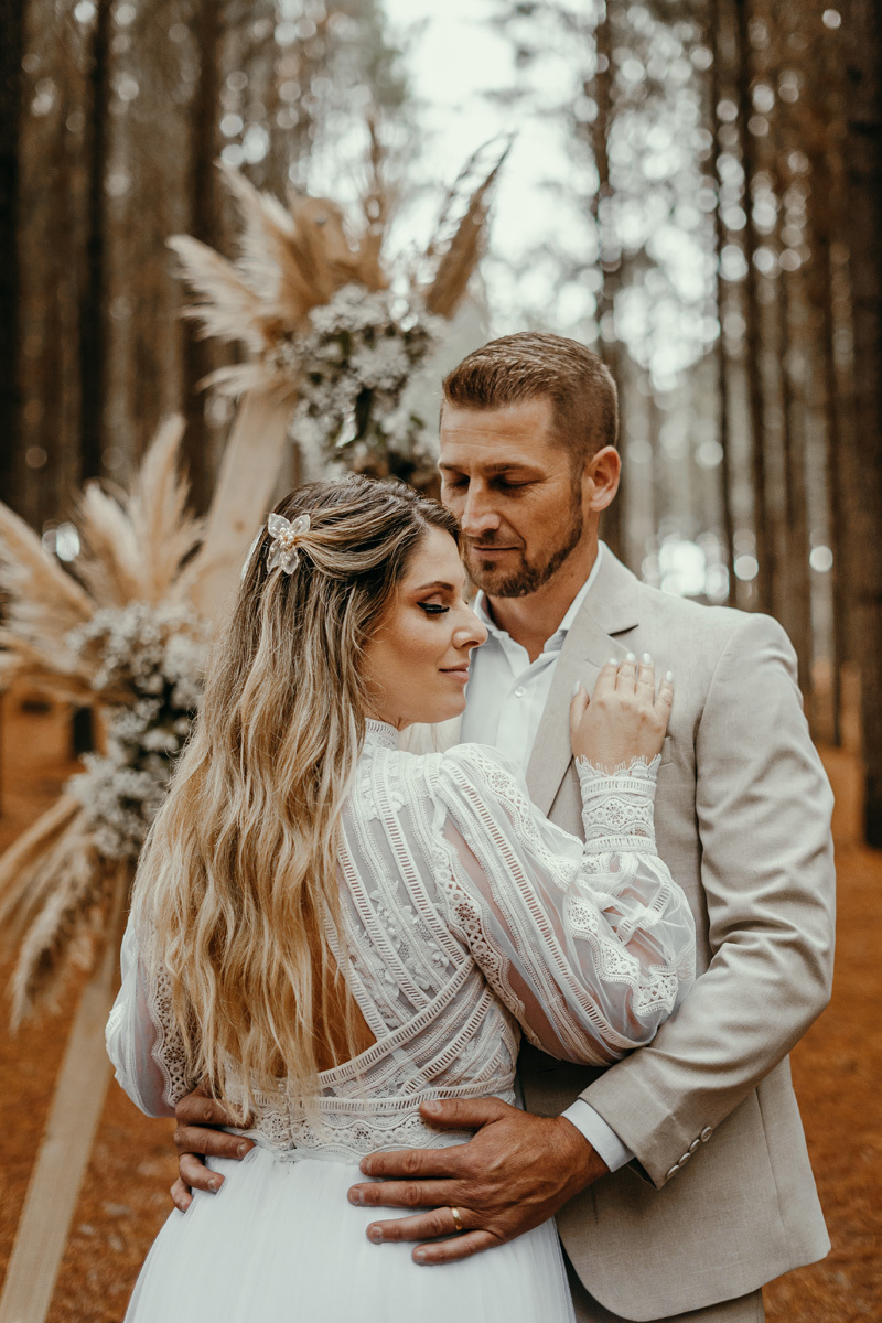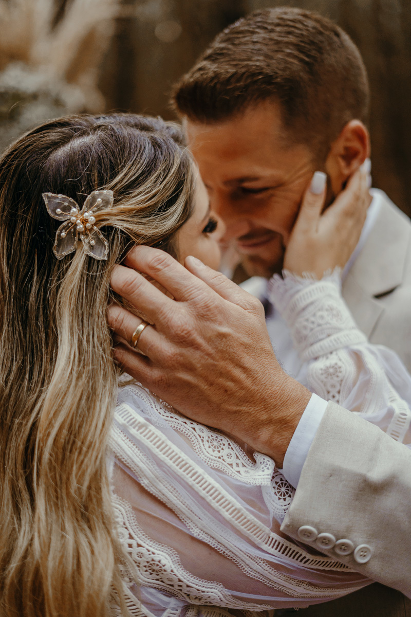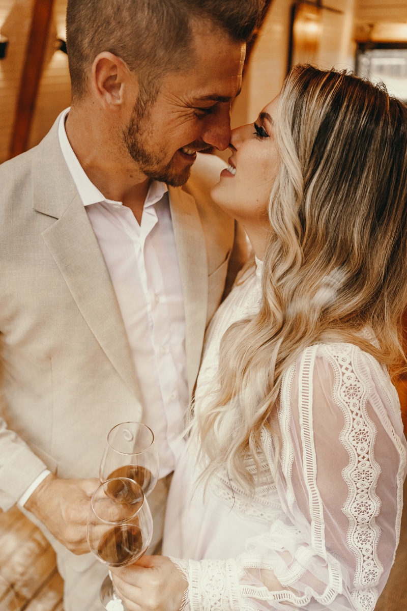 Eles estavam maravilhosos, o vestido boho, o costume em linho, a carta de votos escrita a mão. O primeiro encontro dentro da cabana, as lagrimas de emoção e alegria. A chuva caia la fora e eles optaram por viver esse momento bebendo um vinho.