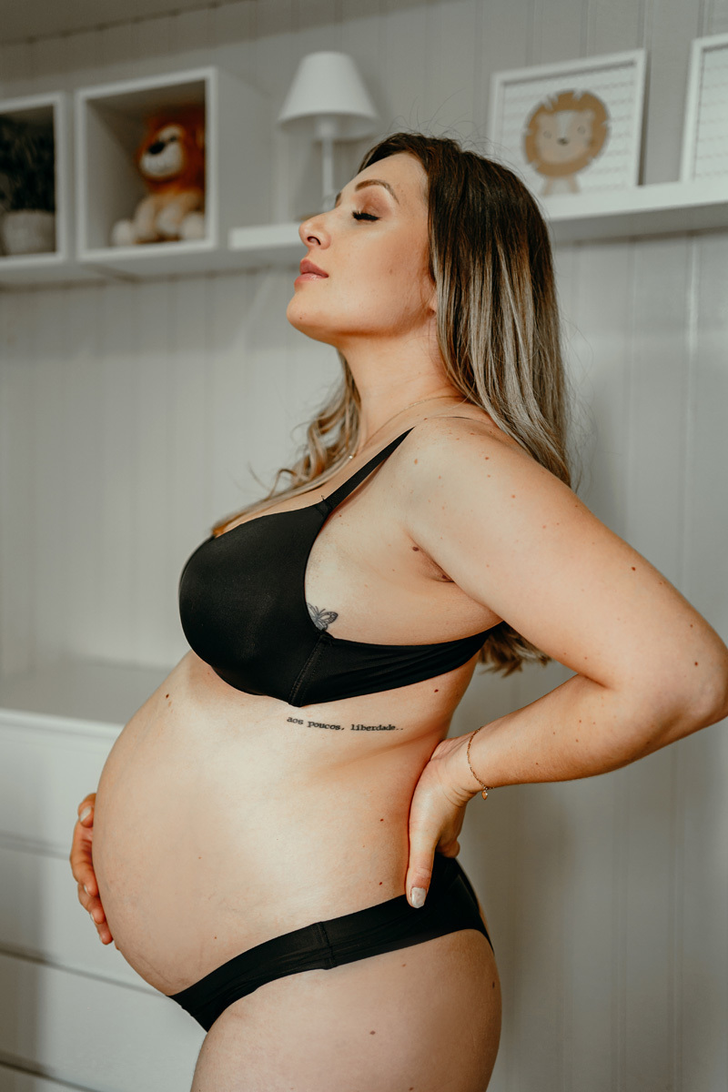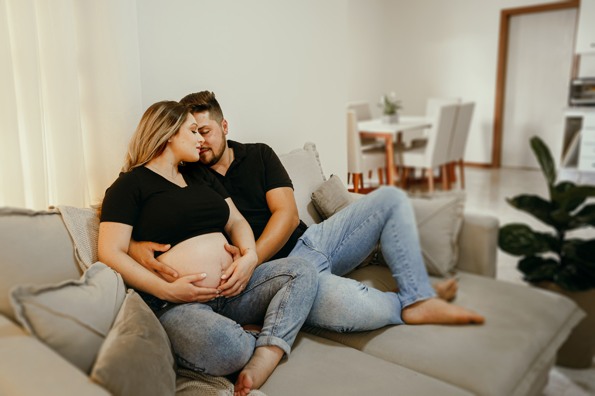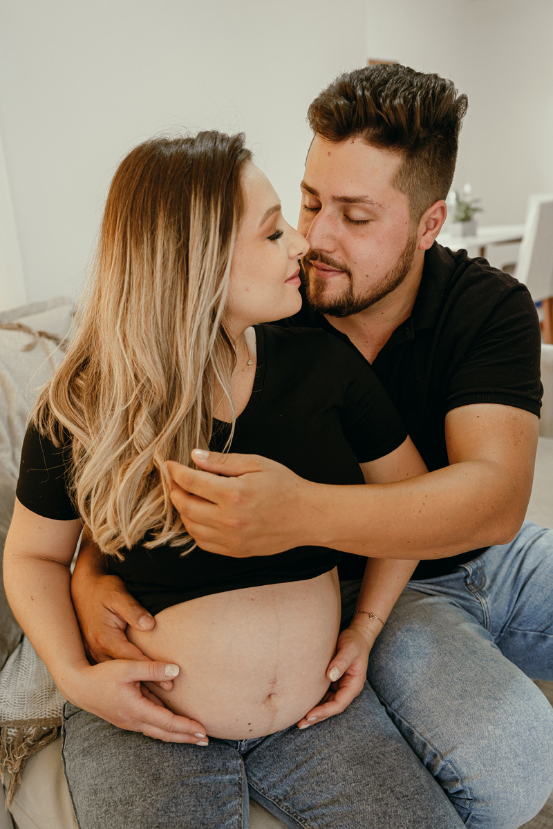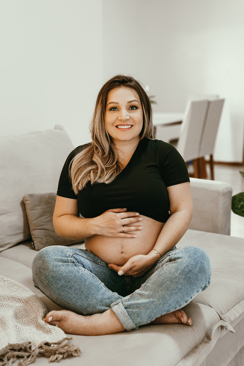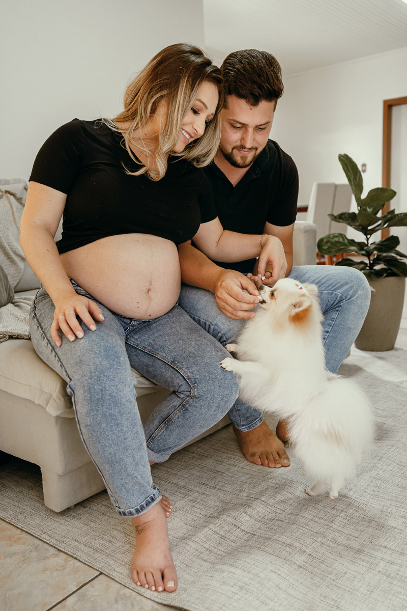 A Gabriela entrou em contato comigo e combinamos os detalhes do ensaio, ela comentou que queria algo em casa pra ter memórias dessa nova fase. No local onde ela e o Rogério estavam começando essa família, essa família nova, com alguns pets, e o Joaquim.