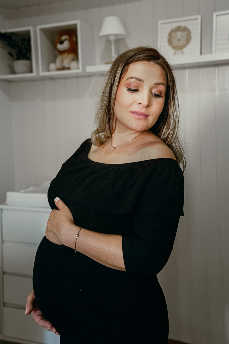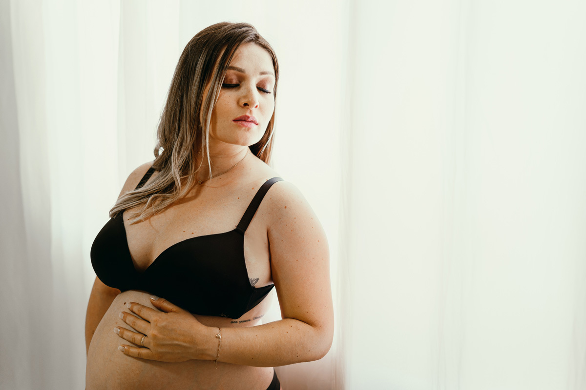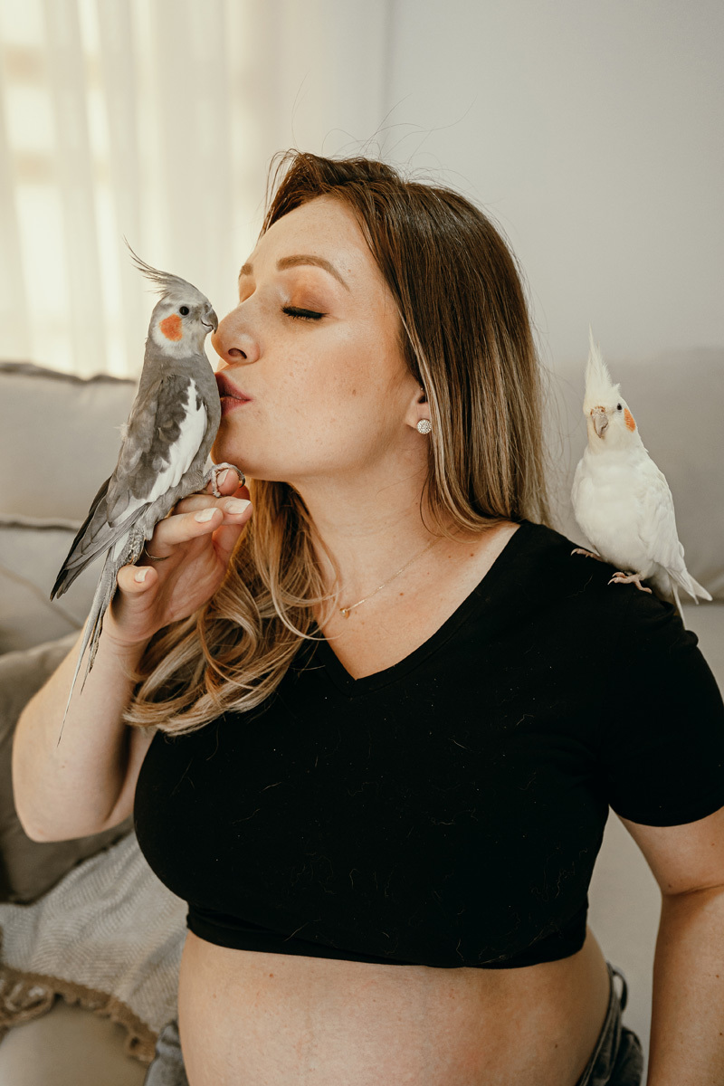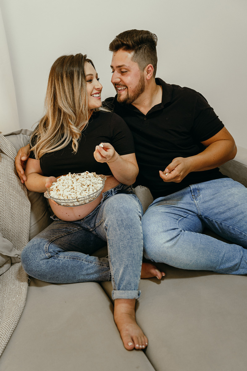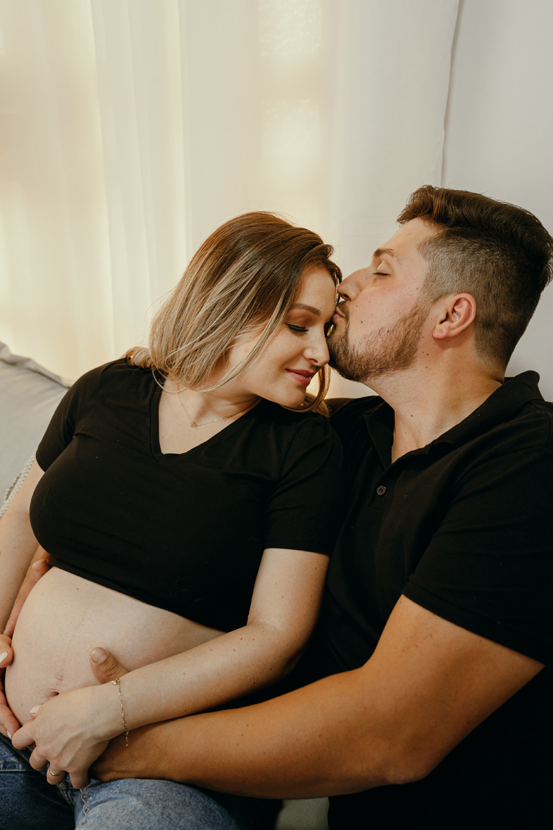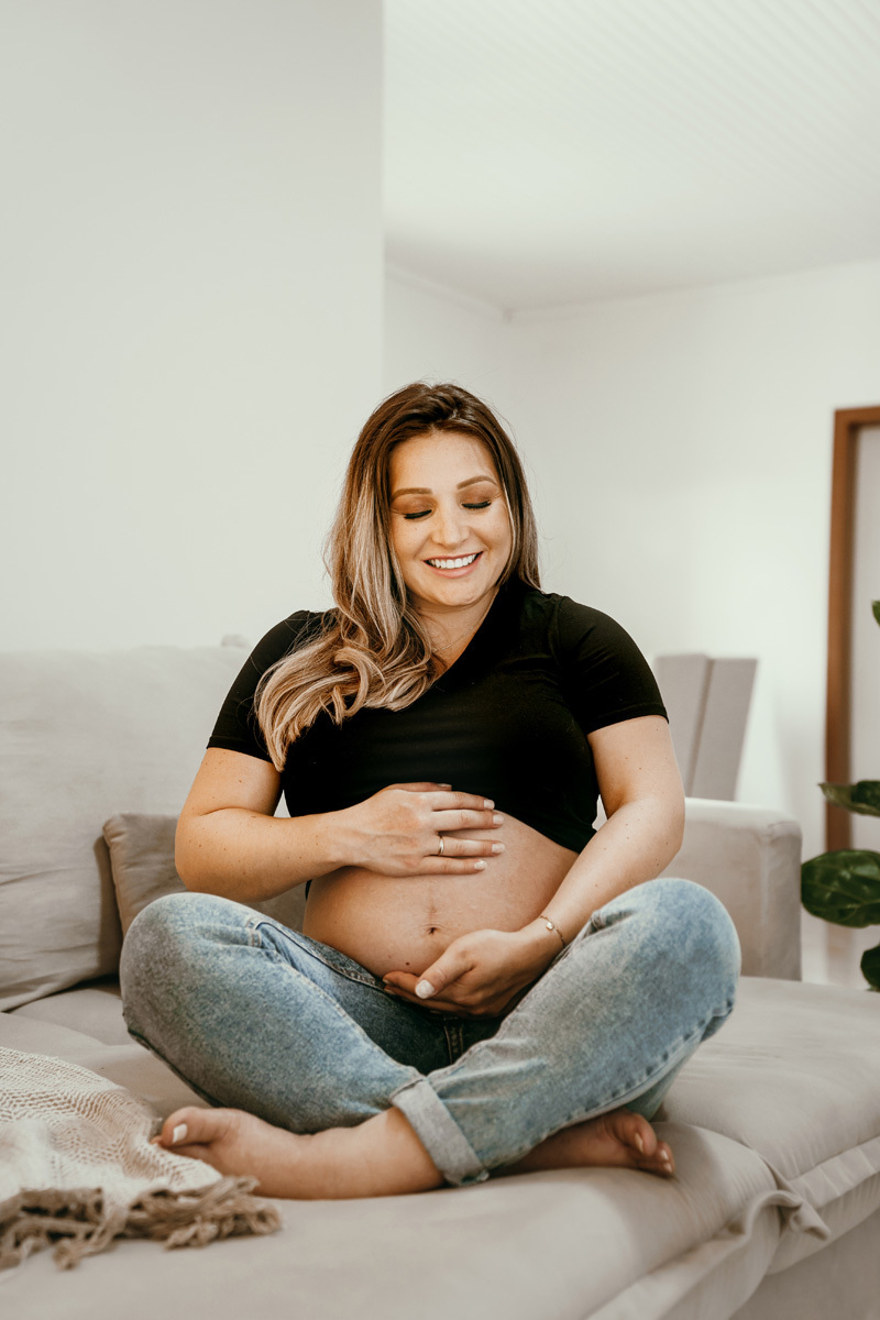 A Gabriela entrou em contato comigo e combinamos os detalhes do ensaio, ela comentou que queria algo em casa pra ter memórias dessa nova fase. No local onde ela e o Rogério estavam começando essa família, essa família nova, com alguns pets, e o Joaquim.
